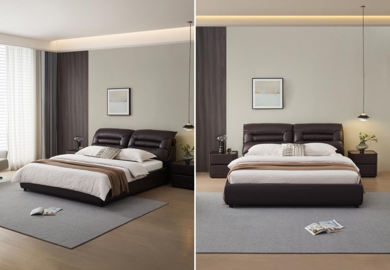 38cm加厚沙发级宽大软靠,给予身体温柔承托,左右分区互不打扰。双层结构设计,柔软层软包内填生态鹅毛与微孔式高弹棉,丰盈饱满,放松腰背;支撑层头枕与屏架填充海绵,呵护颈椎,提升倚靠舒适度。1.3mm加厚头层牛皮,荔枝皮纹细腻柔韧,久用如新,带来奢感体验。高承重碳钢床架搭配多层实木排骨片,承重优越,整夜安睡静音无忧。