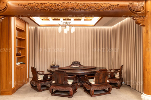 卓木王,作为红木整装高定家居的领航者,多年来,始终以“红木整装世家,传承祖宅首选”为品牌定位,专注于传承祖宅、传世大宅、高端别墅合院、古建寺庙、文化主题酒店与会所等多元场景的整装定制,深度挖掘中式美学内涵,致力于为高端住宅打造独具特色的空间。卓木王红木整装茶室空间以珍贵的材质、精湛的工艺和深厚的文化底蕴,成为众多世家大宅的传世之选。