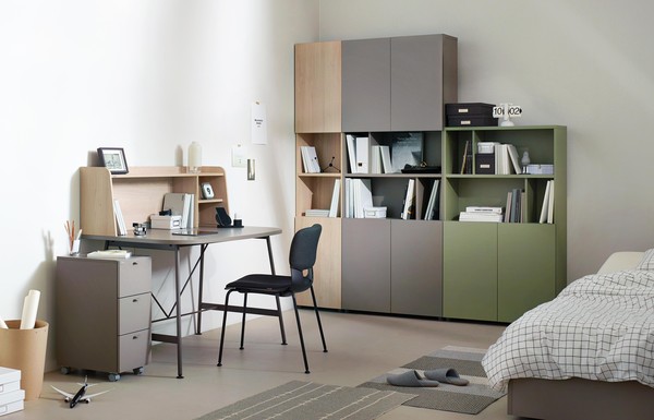 Eddi Kids 系列则以多样化的衣柜及收纳柜见长,三层角柜、塑钢窄柜以强化在角落、畸零与狭小空间的运用,大象桌还可根据孩子成长调节高度使用;Roy Mono 与 Dana 则以学生房为设计架构,以不同的风格与机能性展现生活品味。