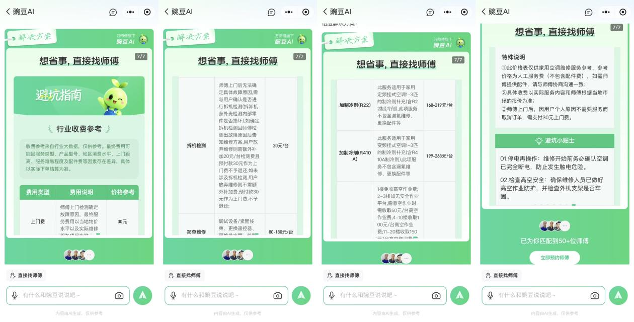 作为家居服务场景的专业AI,豌豆智能助手内置于万师傅微信小程序,无论是家具安装的步骤疑问、家电故障的初步诊断,还是家居保养的专业建议,用户只需打开万师傅小程序,向豌豆描述遇到的具体问题,即可获得专业故障诊断、详细图文教程、行业参考均价及优质师傅履历。