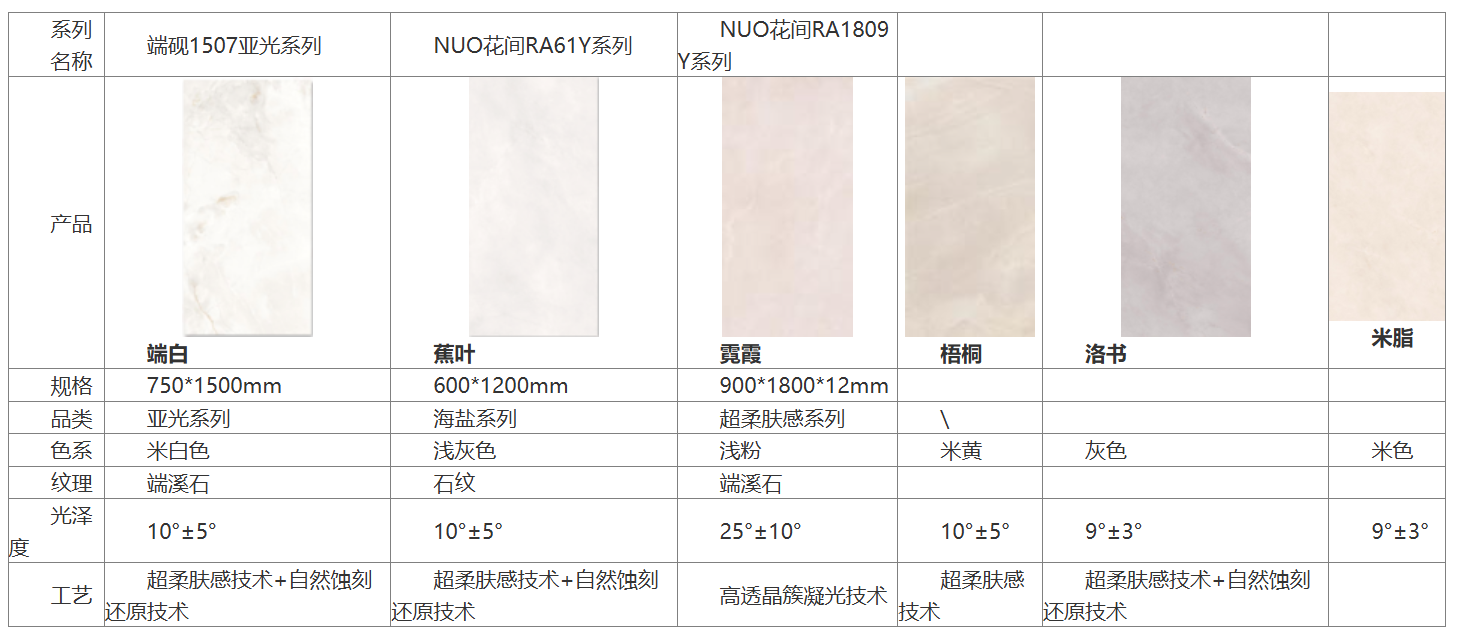 核心产品类型:构建了覆盖岩板、大理石瓷砖、仿古砖的产品体系。部分岩板透光率达15%,适配背光墙面等创意场景;岩板支持异形切割与热弯加工,可用于橱柜、适老家居等。