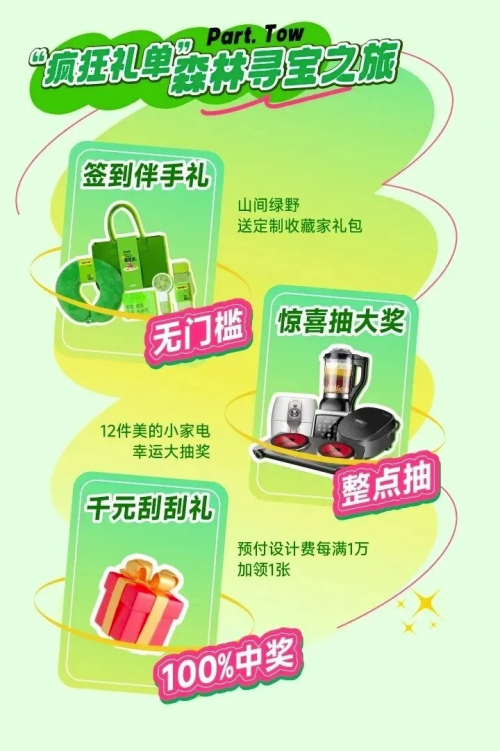 不仅如此,活动还精心策划了森林寻宝之旅,参与者通过签到和各种互动游戏,有机会赢得丰厚奖品,包括定制礼品袋和小家电等,让每个人都能带着惊喜回家。活动现场的“好礼加持”环节同样不容错过。豪华赠品如大牌厨电、氛围软装、自营家具等应有尽有,并且提供了空气治理、免费辅料工艺和金秋换购等多重优惠,为消费者提供了一站式的家装解决方案。