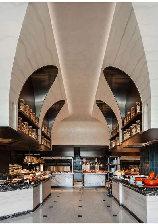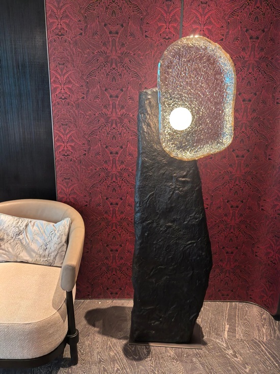 琪宝为该区域定制的大型装饰灯具,以抽象自然形态为灵感,通过比例控制与材质表达,成为空间中的视觉焦点。